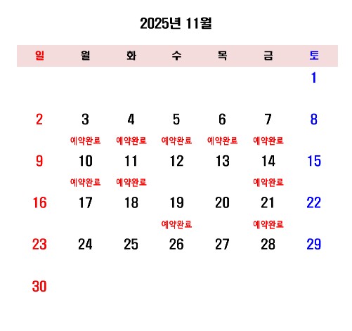 11월 예약접수중 페이지 정보 작성자 최고관리자 작성일 20-12-22 20:56 조회 1,800회 댓글 0건 본문 예약문의 : 031-891-5588 이전글10월 예약 접수중 다음글예약완료를 제외한 모든일자는 예약가능합니다. 목록 댓글목록 0 댓글목록 등록된 댓글이 없습니다.